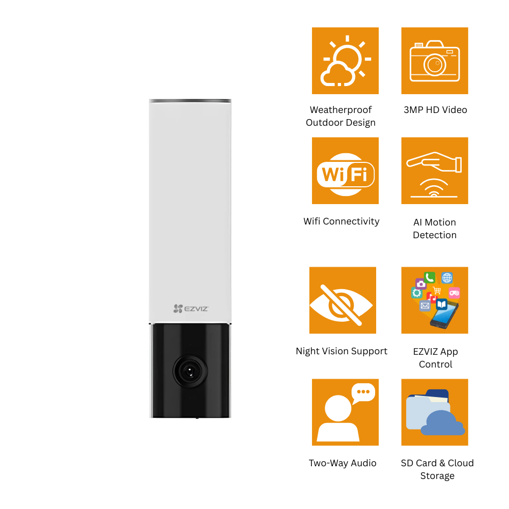 The EZVIZ EL3 is a 2K smart security wall-light camera designed to illuminate your outdoor areas while providing advanced monitoring. It combines an adjustable wall light with AI-powered detection, license plate recognition, and two-way communication for enhanced home protection. The camera delivers sharp 2K video quality, capturing clear details of people, vehicles, and surroundings, day or night. Its intelligent detection system minimizes false alerts by distinguishing between humans, vehicles, and other objects. The built-in speaker and microphone enable real-time communication, allowing you to interact with visitors or respond to potential intruders instantly. With integrated lighting, the EL3 enhances visibility while acting as a deterrent against unwanted activity. Weather-resistant and easy to install, it offers flexible placement and continuous outdoor protection, all controllable via the EZVIZ app for remote monitoring and alerts.