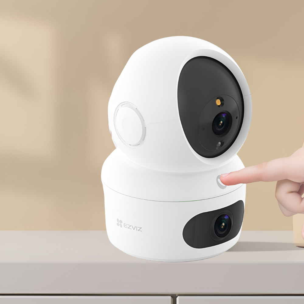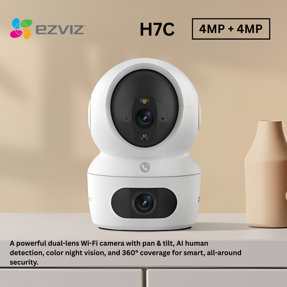 The EZVIZ H7C Dual is a dual-lens smart pan-and-tilt camera providing complete indoor coverage with two 4MP sensors. Its dual-lens design allows simultaneous wide-angle monitoring for full-room visibility and close-up monitoring for detailed observation. Equipped with AI-powered human detection and auto-tracking, it ensures smart and reliable home security by following movement automatically and reducing false alerts. The camera delivers crisp 1080p FHD video with vivid colors and sharp details. Two-way audio enables real-time communication with family members or pets, while night vision ensures clear images in low-light conditions. Lightweight, easy to install, and fully controllable via the EZVIZ app, the H7C Dual offers seamless, intelligent indoor surveillance for comprehensive home protection.