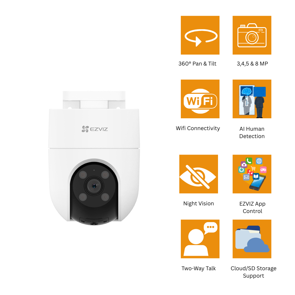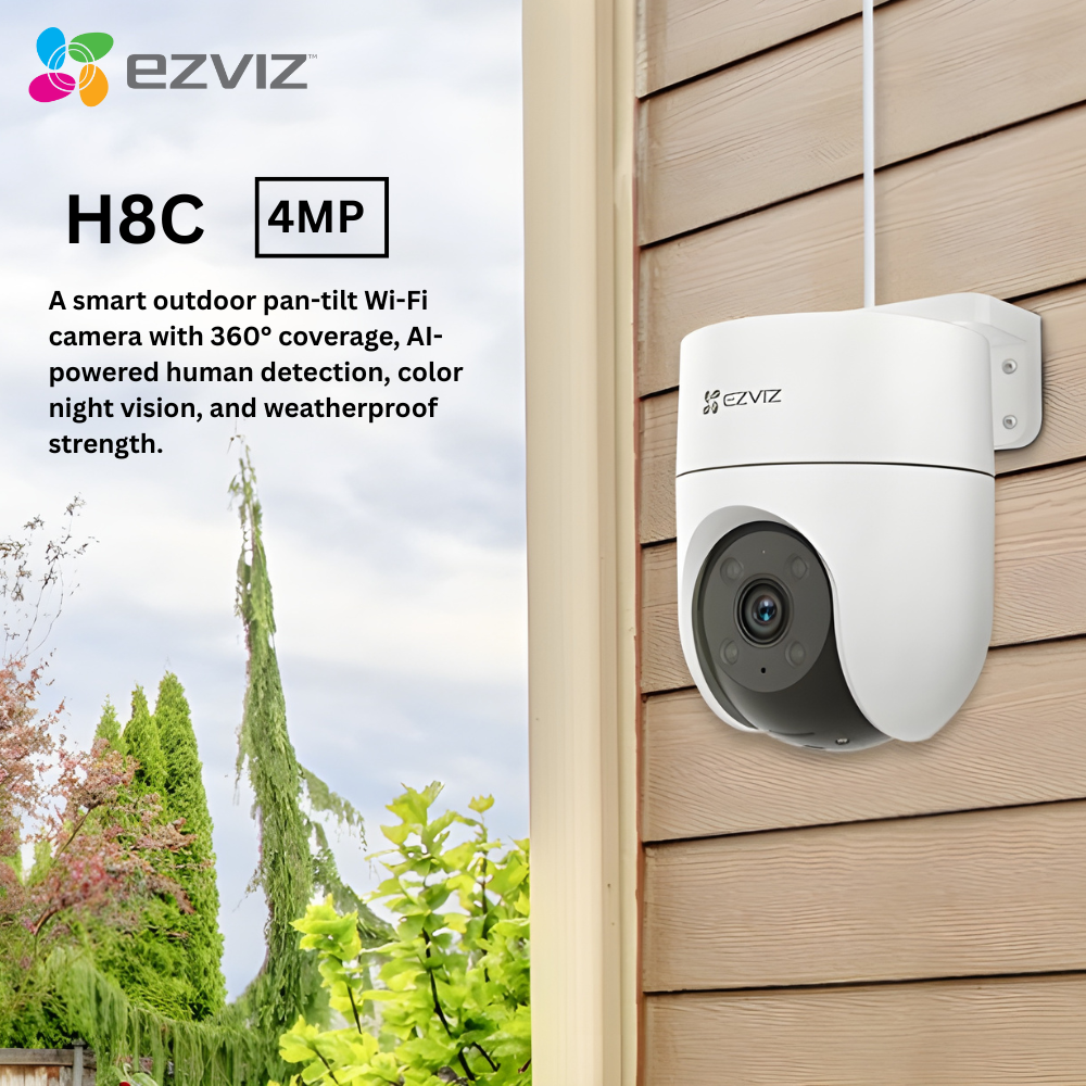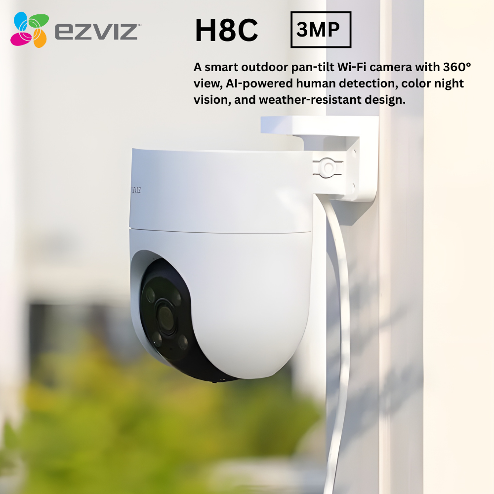 The EZVIZ H8C series offers a range of powerful outdoor Pan-&-Tilt Wi-Fi cameras available in 3MP, 4MP, 5MP, and 8MP/4K versions, designed to provide comprehensive home security. These cameras combine wide-angle coverage, smart tracking, and AI-powered motion detection to ensure that every movement around your property is accurately monitored. Weatherproof construction allows reliable operation in all outdoor conditions, while two-way audio enables real-time communication with visitors or intruders. High-resolution imaging delivers clear, detailed video both day and night, supported by color night vision and infrared capabilities. The pan-and-tilt functionality provides full 360° horizontal and 90° vertical rotation, eliminating blind spots. Easy installation and seamless connectivity through the EZVIZ app allow remote monitoring, instant alerts, and automated security management for complete peace of mind.