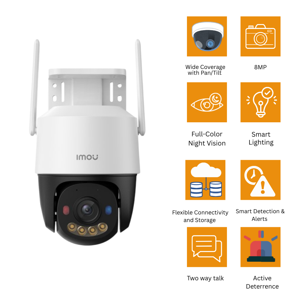 Real-time alerts, remote pan/tilt via app, recording scheduling, cloud / SD storage options, full-color night vision + IR, deterrent lights & siren