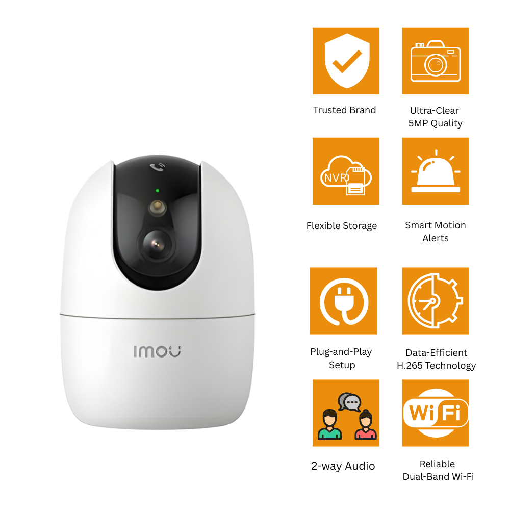 The IMOU Ranger 2 Pro (5MP) is a high-performance indoor Wi-Fi security camera designed for homes, offices, apartments, and retail spaces. It delivers crystal-clear video, intelligent motion detection, and reliable protection day and night.
