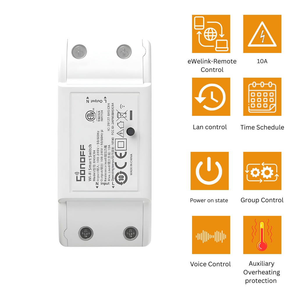 The SONOFF BASICR4 is a compact, 4-channel smart switch that lets you control up to four lights or appliances independently. With Wi-Fi connectivity, eWeLink app support, voice control, and manual wall switch compatibility, it’s ideal for upgrading your home into a smart environment without complicated wiring.
