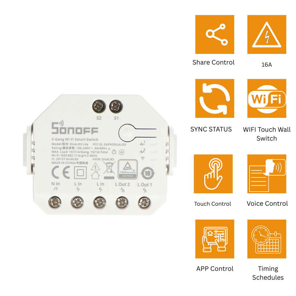 The SONOFF DUALR3 is a powerful in-wall smart module that allows you to control two separate electrical circuits or a single roller shutter/curtain motor independently. Designed for precise automation, it supports real-time power monitoring, smart schedules, and seamless control via the eWeLink app. The module is compatible with voice assistants like Alexa and Google Home, providing convenient hands-free operation. For shutters and blinds, it offers percentage-based control for exact positioning, enabling customized lighting and privacy settings. Compact yet robust, the DUALR3 is ideal for modern smart home setups, offering reliable performance, flexible installation, and intelligent automation that enhances comfort, convenience, and energy efficiency throughout your home.