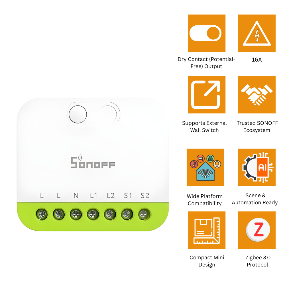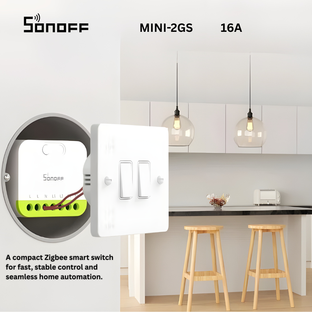 SONOFF MINI-2GS Zigbee Smart Switch is a compact, dual-channel in-wall module that independently controls two electrical circuits or devices from a single smart switch. Powered by Zigbee 3.0, it delivers fast response, high stability, and low power consumption when connected to a compatible Zigbee hub.