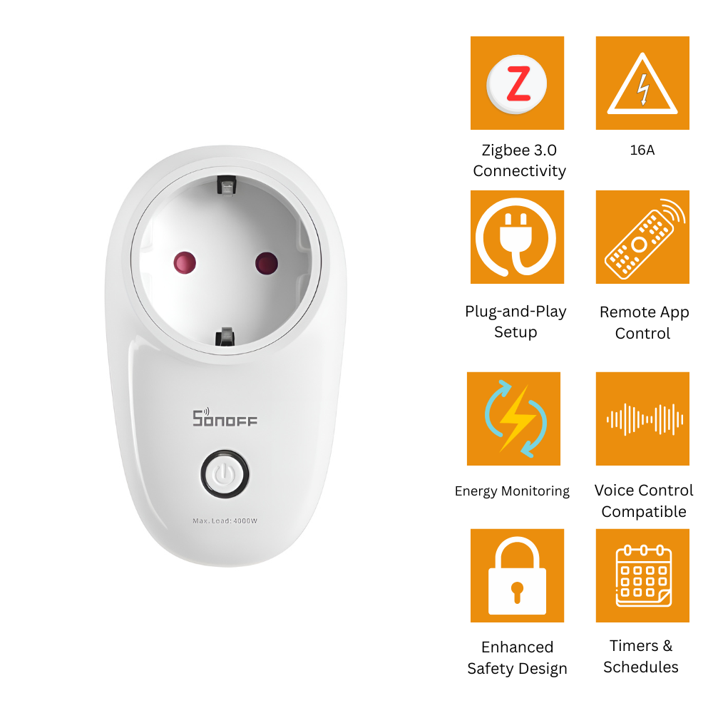SONOFF S26R2ZBTPF-CFH — Zigbee Smart Plug is a reliable and high-capacity Zigbee 3.0 smart plug designed to automate and remotely control home appliances with smooth app control, powerful 16A load support, and broad compatibility. Built for everyday convenience, it allows you to schedule devices, create smart scenes, share control with others, and maintain full functionality even during internet outages thanks to LAN mode. Its fire-retardant PC V0 build, stable Zigbee connectivity, and real-time device status make it ideal for smart homes seeking safety, automation, and efficiency.