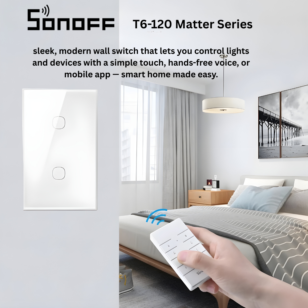 The SONOFF TX Gen2 (T6 120 Type) Smart Touch Wall Switch is a modern smart wall switch designed to replace traditional mechanical switches with an elegant, Wi-Fi-enabled touch solution. It features a premium glass touch panel in a 120-type design and supports 1-gang, 2-gang, and 3-gang configurations. By connecting to the eWeLink app, users can remotely control lighting, create schedules, and build automation scenes. With built-in Matter support, the TX Gen2 integrates seamlessly into mainstream smart home ecosystems, making it a future-ready solution for smart lighting control.