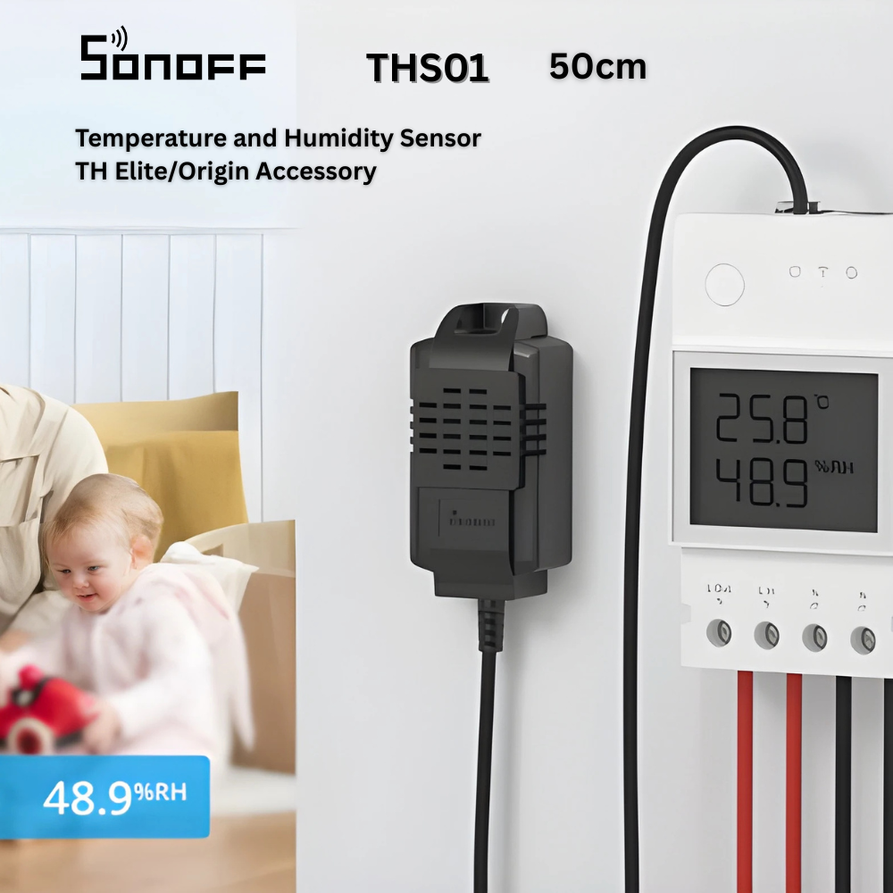 The SONOFF THS01 is a highly accurate temperature and humidity sensor designed to work seamlessly with SONOFF TH series smart switches (TH10, TH16, THR320D, THR316D, and TH Origin/Elite). Featuring a 50cm cable for flexible placement, it provides precise environmental monitoring, making it ideal for homes, greenhouses, server rooms, and other spaces where climate control is important. The sensor enables real-time data collection and can trigger automated actions or alerts through connected SONOFF devices, helping maintain optimal conditions and prevent potential damage caused by temperature or humidity fluctuations. Durable, easy to install, and fully compatible with the TH series ecosystem, the THS01 ensures reliable performance and enhanced comfort, efficiency, and safety in any smart environment.
